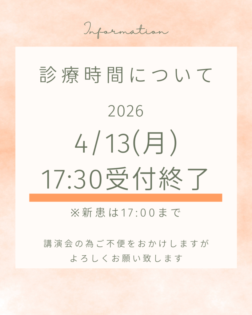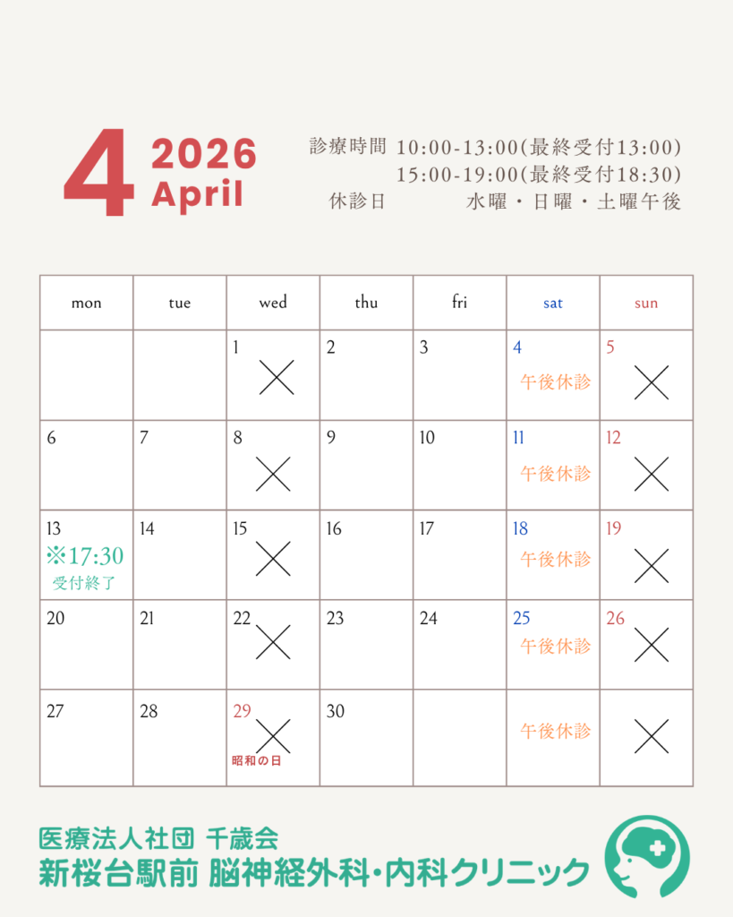 4月の診療案内 2026.04.01 この記事のタイトルとURLをコピーする 2026年4月の診療日です。 4/13(月)は院長講演会の為、最終受付が17:30です。 ※新規患者様は17:00までです。 ご迷惑をお掛けしますがどうぞよろしくお願いいたします。 新桜台駅前脳神経外科・内科クリニック Post この記事のタイトルとURLをコピーする 混雑予測について 前の記事