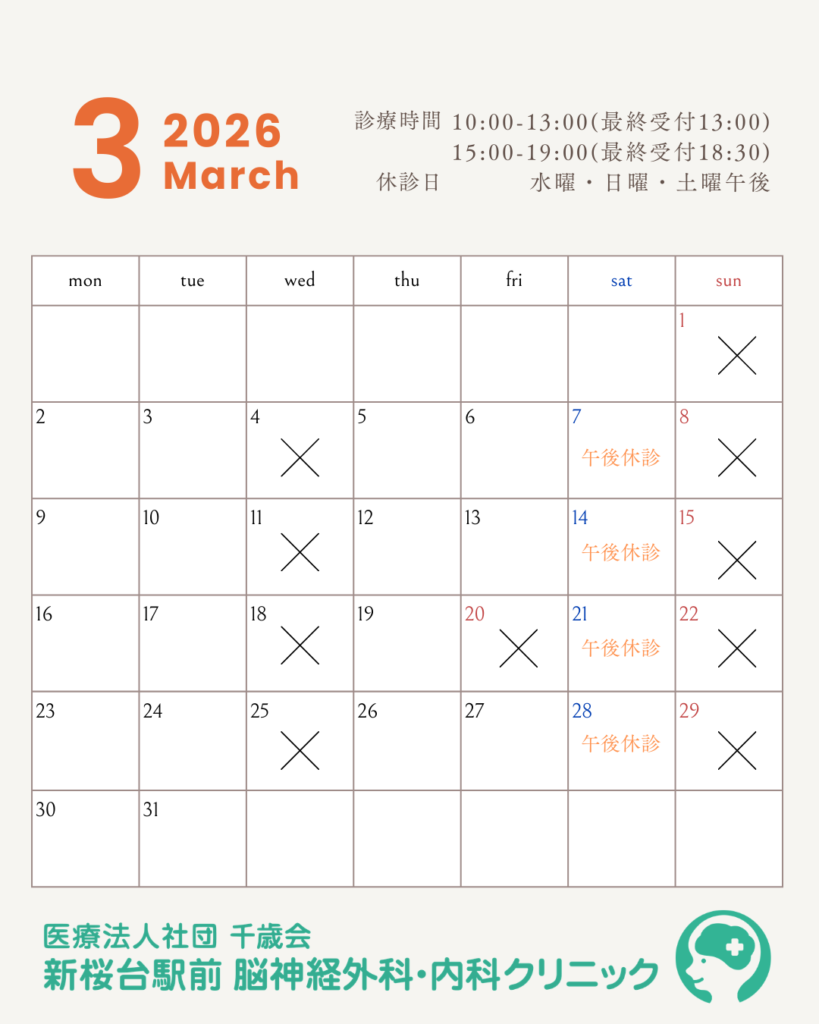 3月の診療案内 2026.02.26 この記事のタイトルとURLをコピーする 2026年3月の診療日です。 どうぞよろしくお願いいたします。 新桜台駅前脳神経外科・内科クリニック Post この記事のタイトルとURLをコピーする 混雑予測について 前の記事